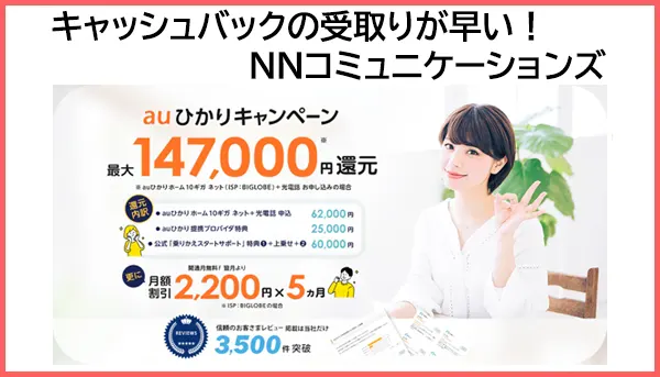 ![]() ![]() auひかり | 自社回線のため通信速度が速い キャッシュバックが高額 解約にかかる費用が高額な場合がある | 5,500円 | 工事費実質無料 キャッシュバック61,000円 | NNコミュニケーションズ |