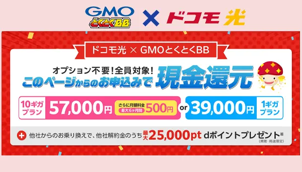 - キャッシュバック最大39,000円(10ギガ最大57,000円)